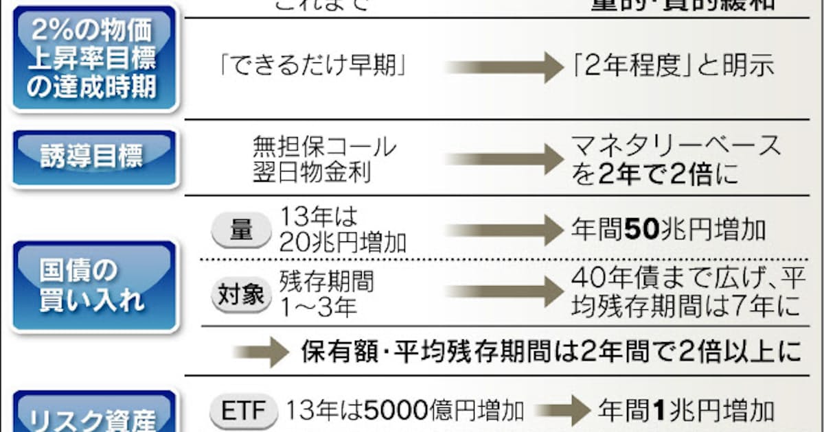 日銀は4日の金融政策決定会合で、2年間で前年比2%の物価上昇率を目指す「量的・質的金融緩和」の導入を決めた。政策目標を金利からマネーの量に切り替え、市場に供給するお金の量を示すマネタリーベースを2年間で倍増させる。国債に加え上場投資信託(ETF)などリスク資産も買い増す。緩和策を総動員して借入金利の低下を促し